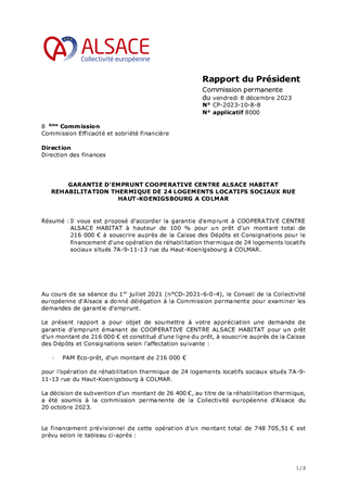 Il vous est proposé d’accorder la garantie d'emprunt à COOPERATIVE CENTRE ALSACE HABITAT à hauteur de 100 % pour un prêt d’un montant total de 216 000 € à souscrire auprès de la Caisse des Dépôts et Consignations pour le financement d'une opération de réhabilitation thermique de 24 logements locatifs sociaux situés 7A-9-11-13 rue du Haut-Koenigsbourg à COLMAR.