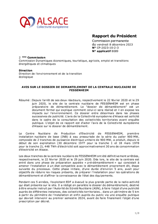 Depuis l'arrêt de ses deux réacteurs, respectivement le 22 février 2020 et le 29 juin 2020, le site de la centrale nucléaire de FESSENHEIM est en phase préparatoire de démantèlement. Le "dossier de démantèlement" est un document formel qui explique comment celui-ci sera réalisé et il en expose les impacts sur l'environnement. Ce dossier entre désormais dans les phases successives de publicité. L'avis de la Collectivité européenne d'Alsace est sollicité dans le cadre de la consultation des collectivités territoriales avant enquête publique. L'objet de ce rapport est d'acter l'avis de la Collectivité européenne d'Alsace sur le dossier de démantèlement.