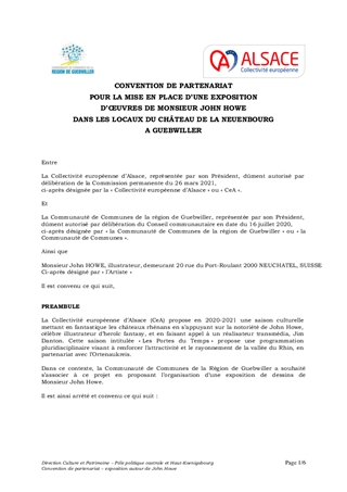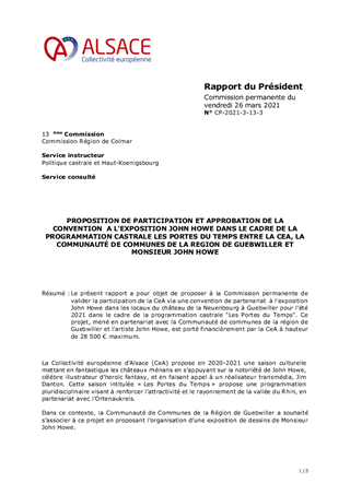 Le présent rapport a pour objet de proposer à la Commission permanente de valider la participation de la CeA via une convention de partenariat à l'exposition John Howe dans les locaux du château de la Neuenbourg à Guebwiller pour l'été 2021 dans le cadre de la programmation castrale "Les Portes du Temps". Ce projet, mené en partenariat avec la Communauté de communes de la région de Guebwiller et l'artiste John Howe, est porté financièrement par la CeA à hauteur de 28 500 € maximum.