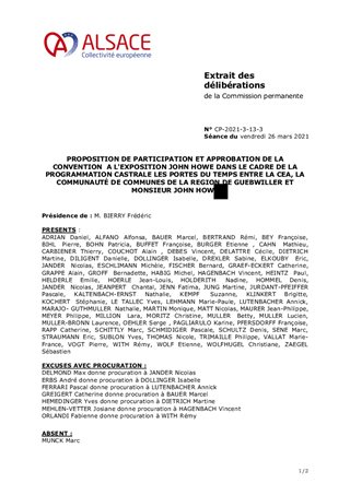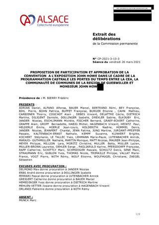 PROPOSITION DE PARTICIPATION ET APPROBATION DE LA CONVENTIONA L'EXPOSITION JOHN HOWE DANS LE CADRE DE LA PROGRAMMATION CASTRALE LES PORTES DU TEMPS ENTRE LA CEA, LA COMMUNAUTÉ DE COMMUNES DE LA REGION DE GUEBWILLER ET MONSIEUR JOHN HOWE