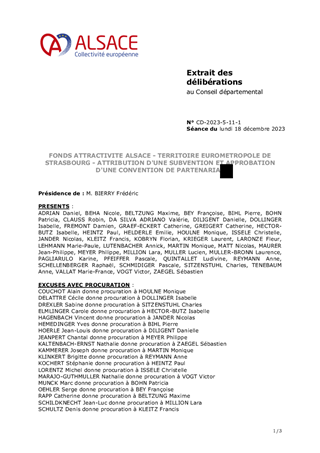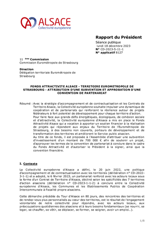 Avec la stratégie d’accompagnement et de contractualisation et les Contrats de Territoire Alsace, la Collectivité européenne souhaite impulser une dynamique de coopération et de partenariats qui renforcent la résilience autour de projets fédérateurs à fort potentiel de développement pour chaque territoire d’action. Pour faire face aux grands défis énergétiques, écologiques, de cohésion sociale et d’attractivité, la Collectivité européenne d'Alsace a mis en place le Fonds Attractivité Alsace qui a vocation à apporter un soutien financier à la réalisation de projets qui répondent aux enjeux du Territoire de l’Eurométropole de Strasbourg, à des besoins non couverts, porteurs de développement et de transformation des territoires et améliorent le Service public alsacien. Au titre de ce fonds, il est proposée à l’Assemblée d’attribuer une subvention d’investissement d’un montant de 700 000 € afin de soutenir un projet, d’approuver les termes de la convention de partenariat à conclure dans le cadre du Fonds Attractivité et d’autoriser le Président à la signer, ainsi que la convention financière.