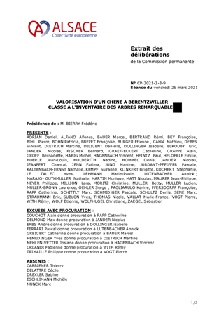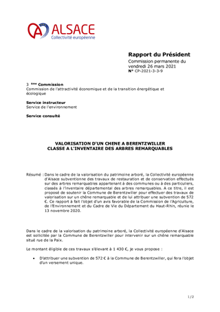 Dans le cadre de la valorisation du patrimoine arboré, la Collectivité européenne d'Alsace subventionne des travaux de restauration et de conservation effectués sur des arbres remarquables appartenant à des communes ou à des particuliers, classés à l’inventaire départemental des arbres remarquables. A ce titre, il est proposé de soutenir la Commune de Berentzwiller pour effectuer des travaux de valorisation sur un chêne remarquable et de lui attribuer une subvention de 572 €. Ce rapport à fait l’objet d’un avis favorable de la Commission de l’Agriculture, de l’Environnement et du Cadre de Vie du Département du Haut-Rhin, réunie le 13 novembre 2020.