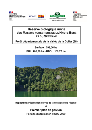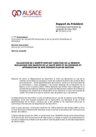 En 2013, le Département du Haut-Rhin a initié une démarche en vue de la création d’une Réserve biologique mixte des massifs forestiers de la Haute-Bers et du Seewand - Forêt départementale de la Doller. Suite à un avis favorable de la Commission « Aires protégées » du Conseil National de la Protection de la Nature le 23 novembre 2020, l’Office National des Forêts vient d’adresser à la Collectivité européenne d'Alsace un projet d’arrêté portant création de la Réserve biologique des massifs de la Haute-Bers et du Seewand. Il vous est proposé de valider cet arrêté ainsi que le premier plan de gestion qui y est associé.