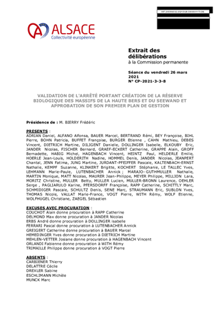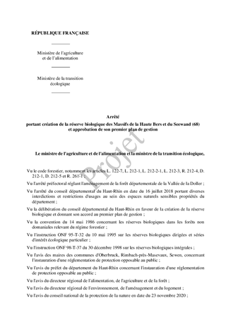 VALIDATION DE L'ARRÊTÉ PORTANT CRÉATION DE LA RÉSERVE BIOLOGIQUE DES MASSIFS DE LA HAUTE BERS ET DU SEEWAND ET APPROBATION DE SON PREMIER PLAN DE GESTION