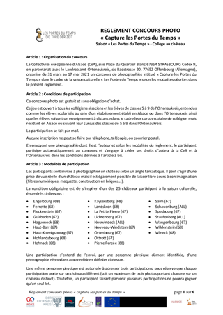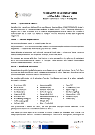 Le présent rapport a pour objet de proposer à la Commission permanente de valider la création de deux concours photographiques et d'arrêter leur règlement dans le cadre de la saison culturelle castrale "Les Portes du Temps". Ces concours photos sont organisés en partenariat avec l'Ortenaukreis matérialisé dans le cadre d'un microprojet INTERREG V Rhin Supérieur.