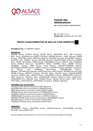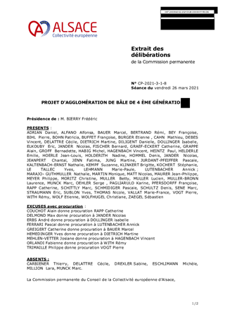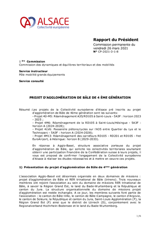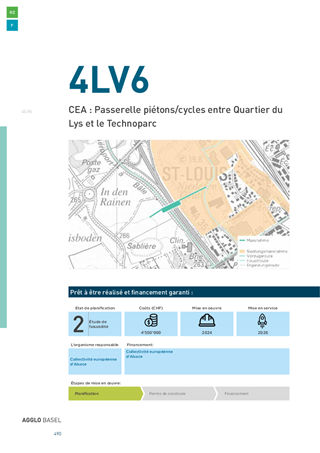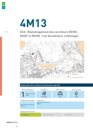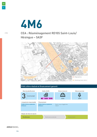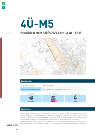 Les projets de la Collectivité européenne d'Alsace pré inscrits au projet d'agglomération de Bâle de 4ème génération sont les suivants: - Projet 4Ü-M5: Réaménagement A35/RD105 à Saint-Louis - 5A3F : horizon 2023 - 2025 ; - Projet 4M6: Réaménagement de la RD105 à Saint-Louis/Hésingue - 5A3F : horizon A (2024-2028); - Projet 4LV6: Passerelle piétons/cycles sur l’A35 entre Quartier du Lys et le Technoparc - 5A3F : horizon A (2024-2028); - Projet 4M13: Réaménagement des carrefours RD105 - RD201 et RD105 - fret EuroAirport, à Hésingue: horizon B (2029-2033). En réponse à Agglo-Basel, structure associative porteuse du projet d'agglomération de Bâle, qui sollicite les collectivités territoriales souhaitant obtenir une participation financière de la Confédération suisse à leurs projets, il vous est proposé de confirmer l'engagement de la Collectivité européenne d'Alsace à réaliser les études nécessaires et à mettre en oeuvre ces projets.