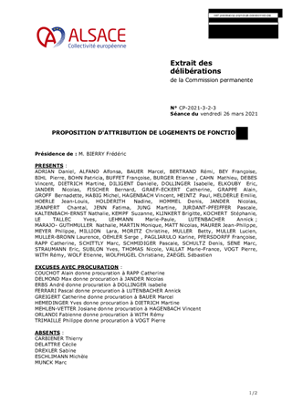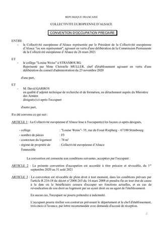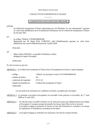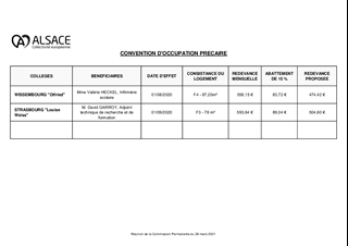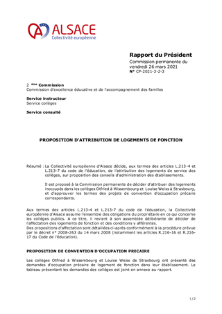 La Collectivité européenne d'Alsace décide, aux termes des articles L.213-4 et L.213-7 du code de l'éducation, de l'attribution des logements de service des collèges, sur proposition des conseils d'administration des établissements. Il est proposé à la Commission permanente de décider d'attribuer des logements inoccupés dans les collèges Otfried à Wissembourg et Louise Weiss à Strasbourg, et d'approuver les termes des projets de convention d'occupation précaire correspondants.
