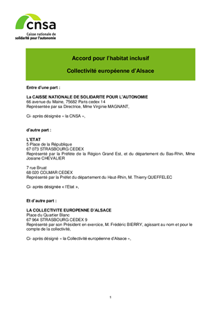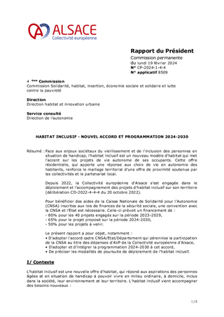 Face aux enjeux sociétaux du vieillissement et de l'inclusion des personnes en situation de handicap, l’habitat inclusif est un nouveau modèle d’habitat qui met l'accent sur les projets de vie autonome de ses occupants. Cette offre résidentielle, qui apporte une réponse aux choix de vie en autonomie des habitants, renforce le maillage territorial d’une offre de proximité soutenue par les collectivités et le partenariat local. Depuis 2022, la Collectivité européenne d'Alsace s'est engagée dans le déploiement et l'accompagnement des projets d’habitat inclusif sur son territoire (délibération CD-2022-4-4-4 du 20 octobre 2022). Pour bénéficier des aides de la Caisse Nationale de Solidarité pour l’Autonomie (CNSA) inscrites aux lois de finances de la sécurité sociale, une convention avec la CNSA et l'Etat est nécessaire. Celle-ci prévoit un financement de : - 80% pour les 40 projets engagés sur la période 2023-2029, - 65% pour le projet proposé sur la période 2024-2030, - 50% pour les projets à venir. Le présent rapport a pour objet, notamment : • D’adopter l’accord cadre CNSA/Etat/Département qui pérennise la participation de la CNSA au titre des dépenses d'AVP de la Collectivité européenne d’Alsace, • D’adopter et d’intégrer la programmation 2024-2030 à cet accord, • De préciser les modalités de poursuite de déploiement de l’habitat inclusif.