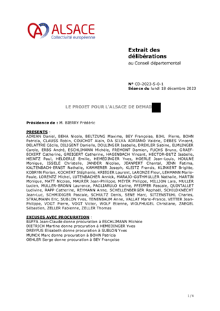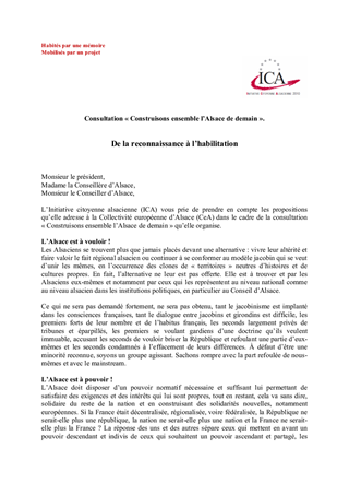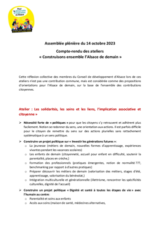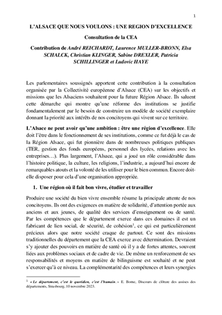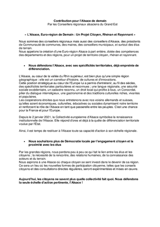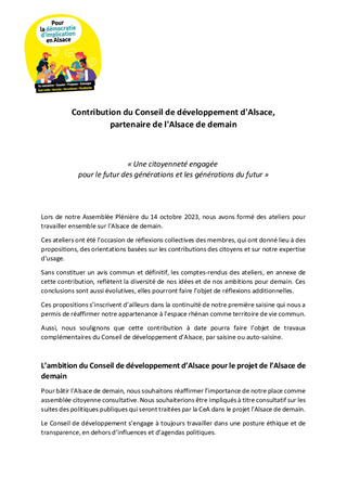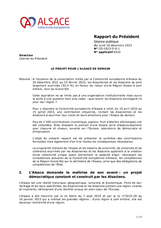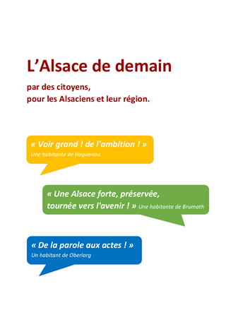 A l’occasion de la consultation initiée par la Collectivité européenne d’Alsace du 20 décembre 2021 au 15 février 2022, les Alsaciennes et les Alsaciens se sont largement exprimés (92,4 %) en faveur du retour d’une Région Alsace à part entière, hors du Grand Est. Cette aspiration ne se limite pas à une organisation institutionnelle mais ouvre la porte à une question bien plus vaste : quel avenir les Alsaciens envisagent-ils pour leur région ? Pour y répondre la Collectivité européenne d’Alsace a initié, du 15 avril 2023 au 15 juillet 2023, une contribution citoyenne, invitant les Alsaciennes et les Alsaciens à exprimer leur vision et leurs ambitions pour l'Alsace de demain. Plus de 2 400 contributions (numérique, papiers, fruit d’ateliers d’échanges) ont été collectées. Elles dressent le portrait d’une Alsace terre d’épanouissement pour chacune et chacun, ouverte sur l’Europe, laboratoire de démocratie et d’implication. L’objet du présent rapport est de présenter la synthèse des contributions formulées mais également d’en tirer toutes les conséquences nécessaires. La singularité rhénane de l’Alsace et les besoins de proximité, de simplicité et de cohérence exprimés par les Alsaciennes et les Alsaciens appellent à la création d’une collectivité unique ayant pleinement la capacité d’agir, réunissant les compétences actuelles de la Collectivité européenne d’Alsace, les compétences de la Région Grand Est sur le périmètre de l’Alsace, ainsi que des délégations de compétences de l’Etat.