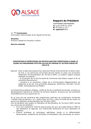 Dans le cadre des programmes nationaux Petites Villes de Demain et Action Cœur de Ville 2, les communes concernées doivent mettre en place une convention d'Opération de Revitalisation du Territoire (ORT). Le présent rapport propose d'adopter et cosigner : - la convention de la Communauté de Communes Sud Alsace Largue et de sa centralité (Dannemarie) ; - l'avenant à la convention initiale de la Communauté d'Agglomération de Haguenau et de ses cinq centralités (Haguenau, Bischwiller, Brumath, Val-de-Moder, Schweighouse-sur-Moder).