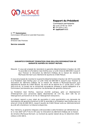 Il vous est proposé de reconduire la garantie départementale à hauteur de 100 % accordée à la Fondation Jean Dollfus pour un prêt initial de 608 000 € souscrit pour financer la rénovation du bâtiment Château de la maison de retraite à Mulhouse-Dornach puis rééchelonné auprès du Crédit Mutuel.