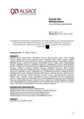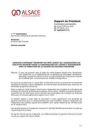 Il vous est proposé, dans le cadre du traité d’apport d’actif entre l’Association LES VIOLETTES et LA FONDATION DE LA MAISON DU DIACONAT MULHOUSE, d’accorder la garantie d'emprunt pour un prêt transféré qui a été souscrit auprès de la CARSAT pour la construction de l’EHPAD à Kingersheim.