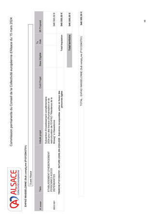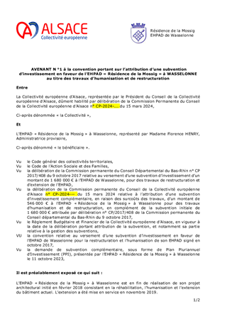 La Collectivité européenne d’Alsace porte une politique volontariste de soutien financier aux établissements d’hébergement pour personnes âgées dépendantes (EHPAD) au travers d’un dispositif facultatif d’aide à l’investissement. Le présent rapport a pour objectif d'approuver l'avenant n°1 attribuant une subvention complémentaire d'investissement d'un montant de 546 000 € à l'EHPAD "Résidence de la Mossig" à Wasselonne pour les travaux d'humanisation et de restructuration et d'autoriser le Président à le signer.