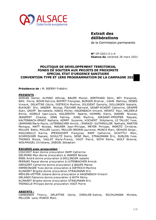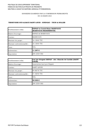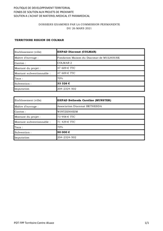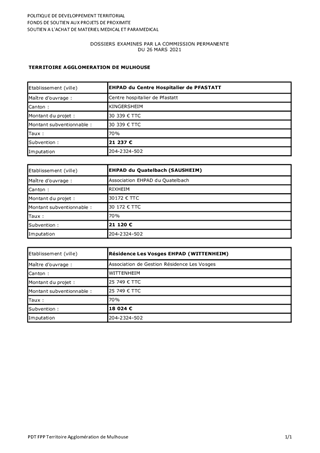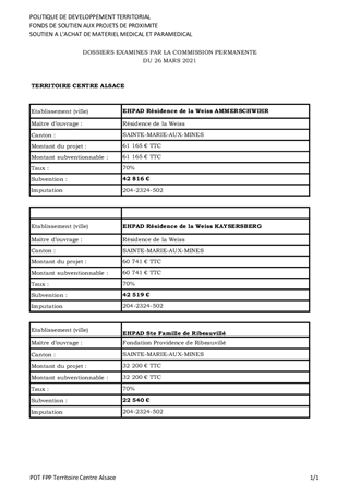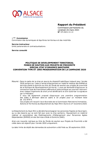 Dans le cadre de la mise en œuvre du dispositif spécifique instauré pour l’année 2020 portant sur l’aide à l’achat d’équipement en matériel médical des EHPAD et services d’aide à domicile au titre du Fonds de soutien aux projets de proximité de la Politique de Développement territorial, il vous est demandé d’approuver la convention type de financement afférente à cette politique qui pourrait intervenir avec chaque organisme de droit privé bénéficiaire et d’en autoriser la signature par le Président. Il vous est également proposé d’approuver une première programmation des aides à attribuer dans ce cadre à 10 projets pour un montant total de 312 879 €. Ces projets ont recueilli l’avis favorable de la Commission Patrimoine Immobilier, Actions et Territoires du Département du Haut-Rhin réunie le 27 novembre 2020.