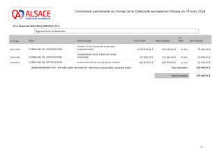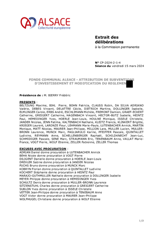 Le présent rapport a pour objet de proposer à la Commission permanente d'approuver l'attribution de subventions d'investissement au titre du Fonds Communal Alsace (FCA), pour un montant total de 1 146 242 €, ainsi que de modifier le règlements de ce fonds.