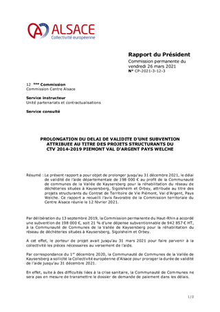 Le présent rapport a pour objet de prolonger jusqu’au 31 décembre 2021, le délai de validité de l’aide départementale de 198 000 € au profit de la Communauté de communes de la Vallée de Kaysersberg pour la réhabilitation du réseau de déchèteries situées à Kaysersberg, Sigolsheim et Orbey, attribuée au titre des projets structurants du Contrat de Territoire de Vie Piémont, Val d’Argent, Pays Welche. Ce rapport a recueilli l’avis favorable de la Commission territoriale du Centre Alsace réunie le 12 février 2021.