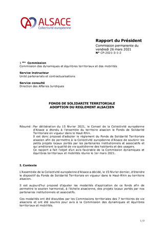 Par délibération du 15 février 2021, le Conseil de la Collectivité européenne d’Alsace a étendu à l’ensemble du territoire alsacien le Fonds de Solidarité Territoriale en vigueur dans le Haut-Rhin. Il est donc proposé d’adopter le règlement du Fonds de Solidarité Territoriale alsacien afin de permettre à la Collectivité européenne d’Alsace de soutenir les petits projets locaux portés par les partenaires institutionnels et associatifs et qui améliorent la qualité de vie quotidienne des habitants et des usagers. Ce rapport a fait l’objet d’un avis favorable de la Commission dynamiques et équilibres territoriaux et mobilités réunie le 1er mars 2021.