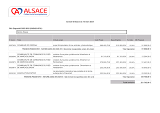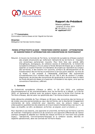 A travers les Contrats de Territoire, la Collectivité européenne d’Alsace soutient des projets structurants qui renforcent l’attractivité du territoire et impulsent une dynamique partenariale nouvelle. Pour faire face aux grands défis énergétiques, écologiques, de cohésion sociale et d’attractivité, la Collectivité européenne d'Alsace a mis en place le Fonds Attractivité Alsace qui a vocation à apporter un soutien financier à la réalisation de projets qui répondent aux enjeux des territoires, à des besoins non couverts, porteurs de développement et de transformation des territoires et améliorent le service public alsacien. Au titre de ce fonds, il est proposé à l’Assemblée d’attribuer des subventions d’investissement d’un montant total de 221 782 € afin de soutenir 5 projets, d’approuver les termes des conventions de partenariat à conclure dans le cadre du Fonds Attractivité Alsace et d’autoriser le Président à les signer, ainsi que les conventions financières y afférant.