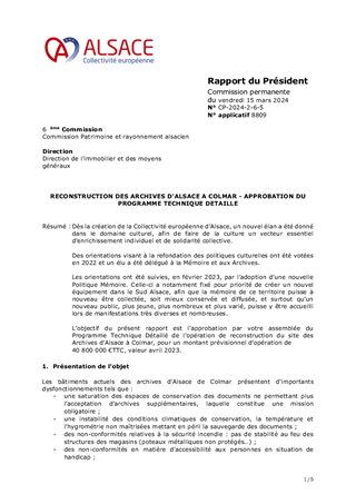 Dès la création de la Collectivité européenne d’Alsace, un nouvel élan a été donné dans le domaine culturel, afin de faire de la culture un vecteur essentiel d’enrichissement individuel et de solidarité collective. Des orientations visant à la refondation des politiques culturelles ont été votées en 2022 et un élu a été délégué à la Mémoire et aux Archives. Les orientations ont été suivies, en février 2023, par l’adoption d’une nouvelle Politique Mémoire. Celle-ci a notamment fixé pour priorité de créer un nouvel équipement dans le Sud Alsace, afin que la mémoire de ce territoire puisse à nouveau être collectée, soit mieux conservée et diffusée, et surtout qu’un nouveau public, plus jeune, plus nombreux et plus varié, puisse y être accueilli lors de manifestations très diverses et nombreuses. L’objectif du présent rapport est l’approbation par votre assemblée du Programme Technique Détaillé de l’opération de reconstruction du site des Archives d’Alsace à Colmar, pour un montant prévisionnel d’opération de 40 800 000 €TTC, valeur avril 2023.