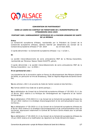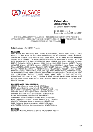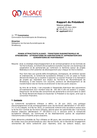 Avec la stratégie d’accompagnement et de contractualisation et les Contrats de Territoire Alsace, la Collectivité européenne souhaite impulser une dynamique de coopération et de partenariats qui renforcent la résilience autour de projets fédérateurs à fort potentiel de développement pour chaque territoire d’action. Pour faire face aux grands défis énergétiques, écologiques, de cohésion sociale et d’attractivité, la Collectivité européenne d'Alsace a mis en place le Fonds Attractivité Alsace qui a vocation à apporter un soutien financier à la réalisation de projets qui répondent aux enjeux du Territoire de l’Eurométropole de Strasbourg, à des besoins non couverts, porteurs de développement et de transformation des territoires et améliorent le Service public alsacien. Au titre de ce fonds, il est proposée à l’Assemblée d’attribuer des subventions d’investissement d’un montant total de 182 361 € afin de soutenir 2 projets, d’approuver les termes des conventions de partenariat à conclure dans le cadre du Fonds Attractivité Alsace et d’autoriser le Président à les signer, ainsi que la convention financière.