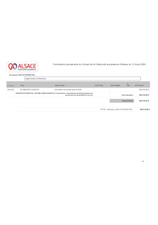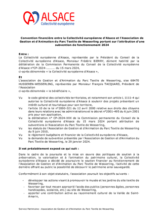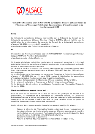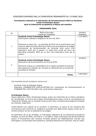 Le présent rapport propose à la Commission permanente d'approuver l'attribution de subventions d'investissement et de fonctionnement et les conventions afférentes au titre du soutien à l'animation du patrimoine pour un montant total de 1 387 810 € , de prendre acte du versement de la contribution statutaire de fonctionnement 2024 au syndicat mixte Archéologie Alsace pour un montant de 1 174 000 € et de lui attribuer une subvention de fonctionnement pour un montant de 26 000 €, soit un montant total de 1 200 000 €. Il est également proposé de proroger le délai de validité de plusieurs subventions d'investissement.