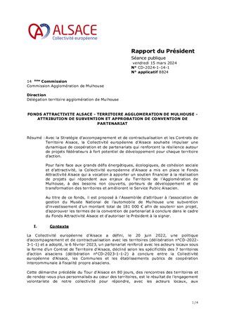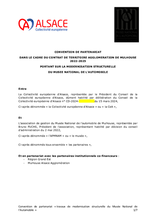 Avec la Stratégie d’accompagnement et de contractualisation et les Contrats de Territoire Alsace, la Collectivité européenne d’Alsace souhaite impulser une dynamique de coopération et de partenariats qui renforcent la résilience autour de projets fédérateurs à fort potentiel de développement pour chaque territoire d’action. Pour faire face aux grands défis énergétiques, écologiques, de cohésion sociale et d’attractivité, la Collectivité européenne d’Alsace a mis en place le Fonds Attractivité Alsace qui a vocation à apporter un soutien financier à la réalisation de projets qui répondent aux enjeux du Territoire de l’Agglomération de Mulhouse, à des besoins non couverts, porteurs de développement et de transformation des territoires et améliorent le Service Public Alsacien. Au titre de ce fonds, il est proposé à l'Assemblée d'attribuer à l’association de gestion du Musée National de l’automobile de Mulhouse une subvention d'investissement d'un montant total de 181 000 € afin de soutenir son projet, d'approuver les termes de la convention de partenariat à conclure dans le cadre du Fonds Attractivité Alsace et d'autoriser le Président à la signer.
