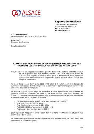 Il vous est proposé d’accorder la garantie d'emprunt à DOMIAL SA HLM à hauteur de 100 % pour un prêt d’un montant total de 1 253 131 € à souscrire auprès de la Caisse des Dépôts et Consignations pour le financement d'une opération d’acquisition amélioration de 8 logements locatifs sociaux situés 10 rue des Vosges à Saint-Louis.