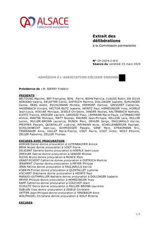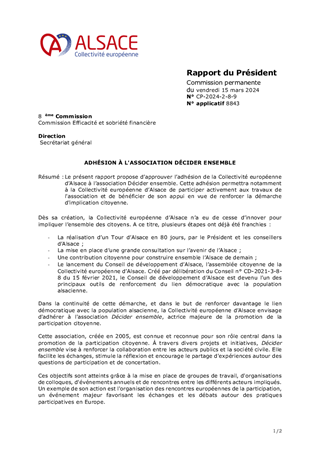Le présent rapport propose d’approuver l’adhésion de la Collectivité européenne d’Alsace à l’association Décider ensemble. Cette adhésion permettra notamment à la Collectivité européenne d’Alsace de participer activement aux travaux de l'association et de bénéficier de son appui en vue de renforcer la démarche d'implication citoyenne.