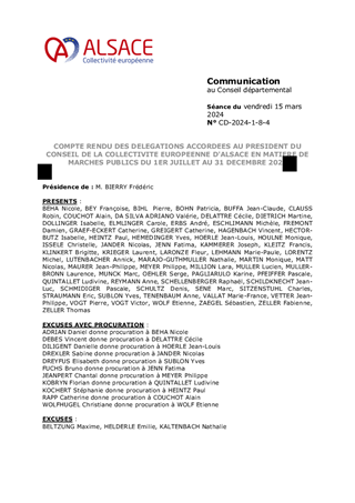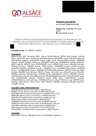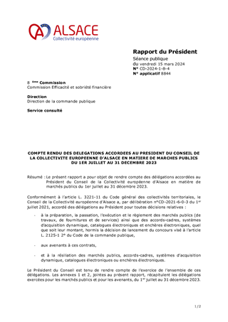 Le présent rapport a pour objet de rendre compte des délégations accordées au Président du Conseil de la Collectivité européenne d’Alsace en matière de marchés publics du 1er juillet au 31 décembre 2023.