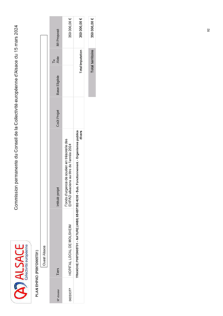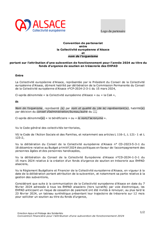 Le présent rapport a pour objet de proposer à la Commission permanente d’approuver l’attribution de subventions de fonctionnement au titre du fonds d’urgence de soutien en trésorerie des EHPAD Alsaciens au bénéfice des établissements précisés en annexe, pour un montant total de 850 000 €, de valider le modèle de convention correspondante à ces subventions et de m'autoriser à les signer.