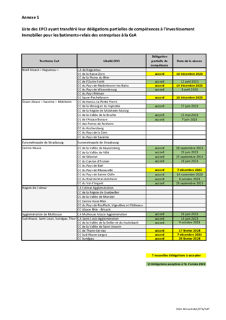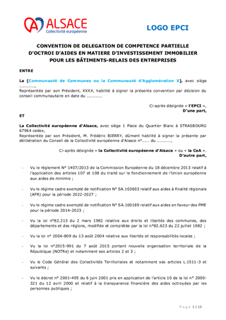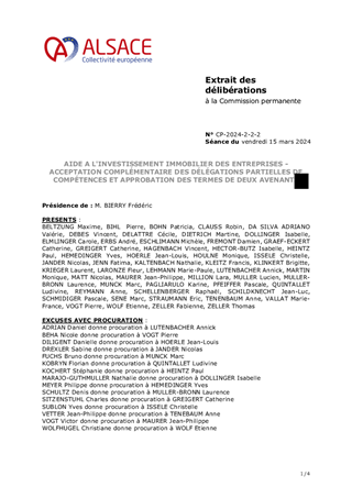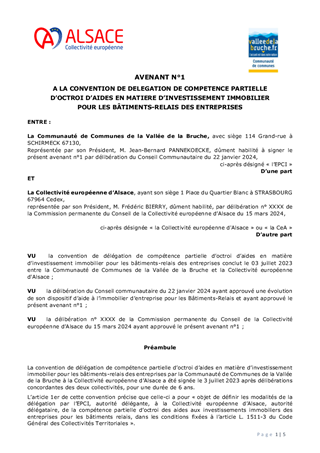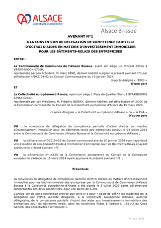 Dans le cadre de la stratégie en faveur de l'attractivité de nos territoires, le présent rapport a pour objet de proposer la poursuite de la mise en oeuvre de notre politique d'intervention sur l’immobilier d’entreprises, initiée par le Conseil de la Collectivité européenne d’Alsace lors de son assemblée du 19 juin 2023. Il vous est ainsi demandé de prendre acte de la création, par 7 intercommunalités d'Alsace, d'un dispositif d’aide à l’immobilier d’entreprises intitulé « Fonds de soutien à l’investissement immobilier pour les bâtiments-relais des entreprises » et d'accepter, de la part des 7 intercommunalités volontaires d'Alsace, la délégation de la compétence d’octroi des aides relevant du dispositif d’aides à l’immobilier d’entreprises précité. Afin d'homogénéiser le dispositif de délégations à l'échelle de l'Alsace, il est nécessaire d’ajuster, par voie d’avenant, les conventions initiales passées avec les premières intercommunalités volontaires. L'évolution porte, d’une part, sur le taux d’intervention global de l’avance (de l’EPCI et de la Collectivité européenne d’Alsace) qui s’élève désormais à 30 % maximum du coût du projet immobilier éligible ainsi que, d’autre part, sur la clé de répartition des allocations d’avances entre l’EPCI et la Collectivité européenne d'Alsace qui sera désormais définie au cas par cas, en fonction des projets et des capacités financières de l’EPCI. Il vous est ainsi proposé d'accepter les Avenants n°1 aux conventions de délégation de la compétence partielle d’octroi d'aides en matière d'investissement immobilier pour les bâtiments-relais des entreprises, concernant 2 Communautés de Communes.