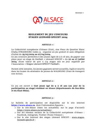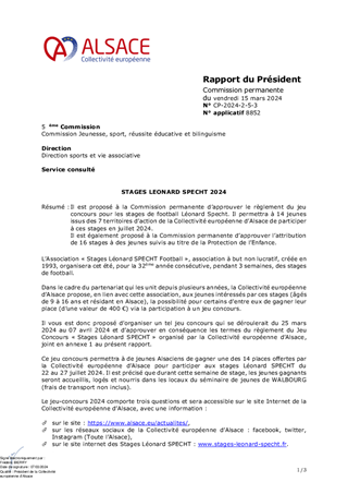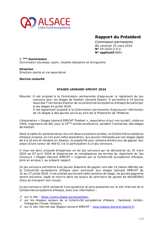 Il est proposé à la Commission permanente d’approuver le règlement du jeu concours pour les stages de football Léonard Specht. Il permettra à 14 jeunes issus des 7 territoires d’action de la Collectivité européenne d’Alsace de participer à ces stages en juillet 2024. Il est également proposé à la Commission permanente d’approuver l’attribution de 16 stages à des jeunes suivis au titre de la Protection de l’Enfance.