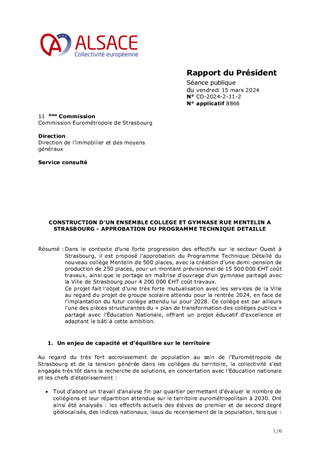 Dans le contexte d’une forte progression des effectifs sur le secteur Ouest à Strasbourg, il est proposé l’approbation du Programme Technique Détaillé du nouveau collège Mentelin de 500 places, avec la création d’une demi-pension de production de 250 places, pour un montant prévisionnel de 15 500 000 €HT coût travaux, ainsi que le portage en maîtrise d'ouvrage d’un gymnase partagé avec la Ville de Strasbourg pour 4 200 000 €HT coût travaux. Ce projet fait l’objet d’une très forte mutualisation avec les services de la Ville au regard du projet de groupe scolaire attendu pour la rentrée 2024, en face de l’implantation du futur collège attendu lui pour 2028. Ce collège est par ailleurs l’une des pièces structurantes du « plan de transformation des collèges publics » partagé avec l’Éducation Nationale, offrant un projet éducatif d’excellence et adaptant le bâti à cette ambition.