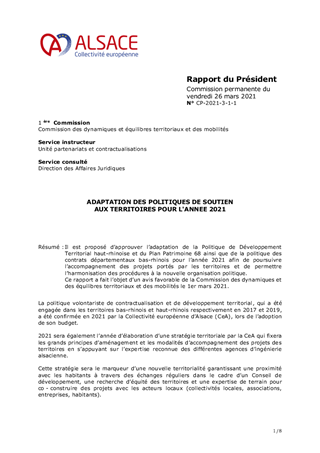 Il est proposé d’approuver l’adaptation de la Politique de Développement Territorial haut-rhinoise et du Plan Patrimoine 68 ainsi que de la politique des contrats départementaux bas-rhinois pour l’année 2021 afin de poursuivre l’accompagnement des projets portés par les territoires et de permettre l’harmonisation des procédures à la nouvelle organisation politique. Ce rapport a fait l’objet d’un avis favorable de la Commission des dynamiques et des équilibres territoriaux et des mobilités le 1er mars 2021.
