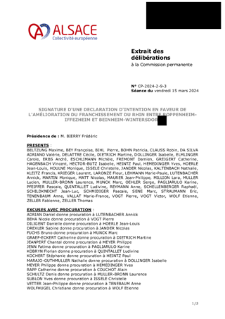 Les franchissements du Rhin entre Strasbourg et Karlsruhe sont nombreux mais souffrent de contraintes d’entretien ou d’exploitation, du fait de leurs usages mixtes (ouvrages ferroviaires ou hydroélectriques) ou de leur nature (bacs). Sur le secteur entre Beinheim et Roppenheim, le trafic routier est élevé et croissant, et des réflexions locales sont en cours pour développer les mobilités ferroviaires et cyclables. C'est dans ce contexte que la Collectivité européenne d'Alsace (CeA) et ses partenaires allemands le Ministerium für Verkehr Baden-Württemberg et le Regierungspräsidium Karlsruhe s'associent pour étudier l'amélioration du franchissement du Rhin dans le corridor situé entre l’ouvrage hydroélectrique (Roppenheim-Iffezheim) et le pont de Beinheim-Wintersdorf, dans une perspective de développement multimodal des mobilités. Le présent rapport vise à approuver la signature d'une déclaration d'intention entre les partenaires du projet.