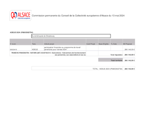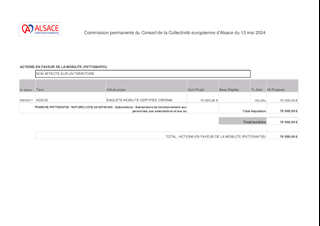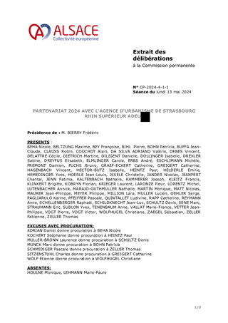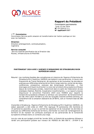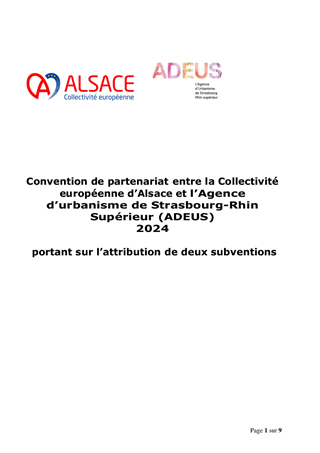 Les multiples facettes des compétences et missions de l'Agence d'Urbanisme de Strasbourg Rhin Supérieur (ADEUS) permettent à ses partenaires, à travers son Programme de Travail Partenarial, de capitaliser et de mutualiser les données et analyses aux différentes échelles de territoire (observatoires, portail de données, conférences, prospective, analyses des dynamiques territoriales …). Ces éclairages contribuent à alimenter la vision de la Collectivité européenne d’Alsace depuis de nombreuses années, notamment dans le cadre de l’élaboration de ses stratégies (Habitat, Mobilité, Coopération transfrontalière…). Le rapport propose d'approuver la convention financière 2024 avec l'ADEUS pour laquelle la Collectivité européenne d'Alsace lui attribue une subvention de fonctionnement de 336 146 € (dont 70 000 € au titre de l'enquête mobilité certifiée Céréma), en complément de la cotisation statutaire de 29 854 €, soit un montant total de 366 000 €.