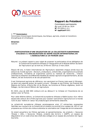 Le présent rapport a pour objet de proposer la participation d’une délégation de la Collectivité européenne d’Alsace à l’inauguration de la 60ième édition du Salon de l’Agriculture qui se tient du 24 février 2024 au 3 mars 2024.
