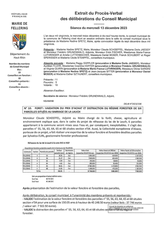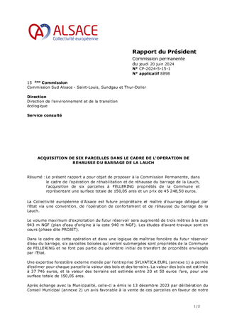 Le présent rapport a pour objet de proposer à la Commission Permanente, dans le cadre de l’opération de réhabilitation et de réhausse du barrage de la Lauch, l’acquisition de six parcelles à FELLERING propriétés de la Commune et représentant une surface totale de 150,05 ares et un prix de 45 248,50 euros.