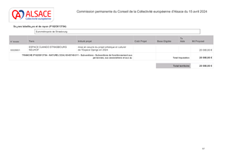 Le présent rapport a pour objet de proposer à la Commission permanente d’approuver l’attribution de subventions pour le soutien aux structures ressources de la pratique amateur et de l'éducation artistique et culturelle, aux festivals d’Alsace, aux opérateurs de territoires pour un montant total de 693 040 € en fonctionnement et 74 528 € en investissement et d'autoriser le Président à signer les conventions financières à intervenir avec les structures concernées pour leurs activités en 2024.