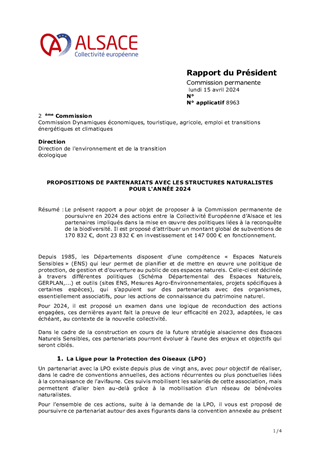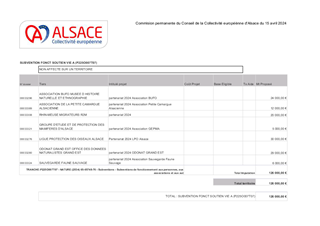 Le présent rapport a pour objet de proposer à la Commission permanente de poursuivre en 2024 des actions entre la Collectivité Européenne d’Alsace et les partenaires impliqués dans la mise en œuvre des politiques liées à la reconquête de la biodiversité. Il est proposé d’attribuer un montant global de subventions de 170 832 €, dont 23 832 € en investissement et 147 000 € en fonctionnement.