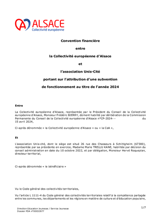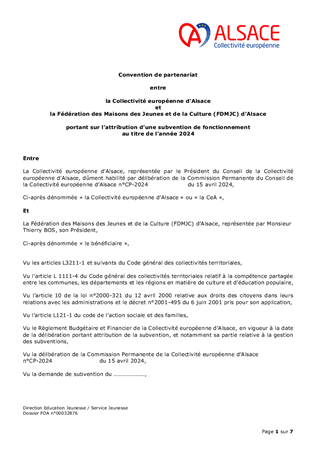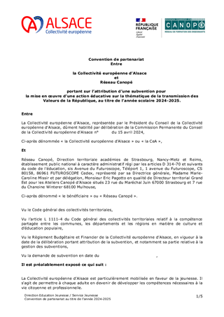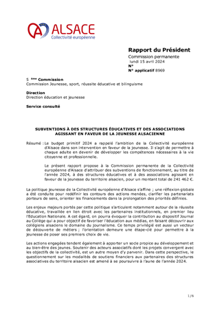 Le budget primitif 2024 a rappelé l’ambition de la Collectivité européenne d’Alsace dans son intervention en faveur de la jeunesse. Il s'agit de permettre à chaque adulte en devenir de développer les compétences nécessaires à la vie citoyenne et professionnelle. Le présent rapport propose à la Commission permanente de la Collectivité européenne d’Alsace d'attribuer des subventions de fonctionnement, au titre de l'année 2024, à des structures éducatives et à des associations agissant en faveur de la jeunesse du territoire alsacien, pour un montant total de 241 462 €.