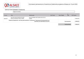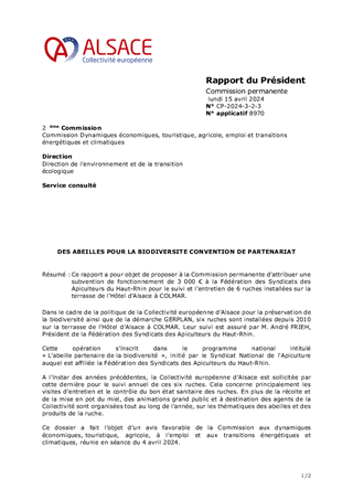 Ce rapport a pour objet de proposer à la Commission permanente d’attribuer une subvention de fonctionnement de 3 000 € à la Fédération des Syndicats des Apiculteurs du Haut-Rhin pour le suivi et l’entretien de 6 ruches installées sur la terrasse de l’Hôtel d’Alsace à COLMAR.