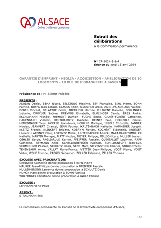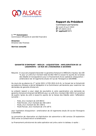 Il vous est proposé d’accorder la garantie d'emprunt à NEOLIA à hauteur de 100 % pour un prêt d’un montant total de 862 483 € à souscrire auprès de la Caisse des Dépôts et Consignations pour le financement d'une opération d’acquisition - amélioration de 10 logements situés 18 rue de l’Orangerie à SAVERNE.