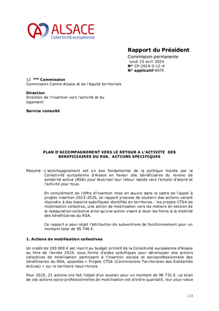 L’accompagnement est un axe fondamental de la politique menée par la Collectivité européenne d’Alsace en faveur des bénéficiaires du revenu de solidarité active (RSA) pour favoriser leur retour rapide vers l’emploi d’abord et l’activité pour tous. En complément de l’offre d’insertion mise en œuvre dans le cadre de l’appel à projets insertion 2023-2025, ce rapport propose de soutenir des actions venant répondre à des besoins spécifiques identifiés en territoires : les projets CTSA de mobilisation collective, une action de mobilisation vers les métiers en tension de la restauration collective ainsi qu’une action visant à lever les freins à la mobilité des bénéficiaires du RSA. Ce rapport a pour objet l’attribution de subventions de fonctionnement pour un montant total de 95 746 €.