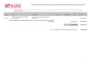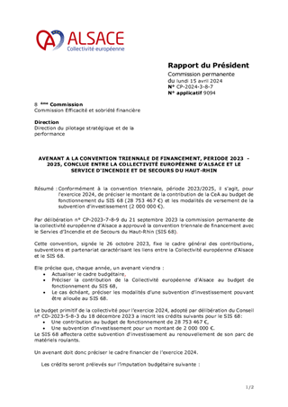 Conformément à la convention triennale, période 2023/2025, il s'agit, pour l'exercice 2024, de préciser le montant de la contribution de la CeA au budget de fonctionnement du SIS 68 (28 753 467 €) et les modalités de versement de la subvention d'investissement (2 000 000 €).