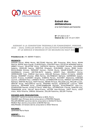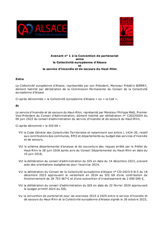 AVENANT A LA CONVENTION TRIENNALE DE FINANCEMENT, PERIODE 2023- 2025, CONCLUE ENTRE LA COLLECTIVITÉ EUROPÉENNE D'ALSACE ET LE SERVICE D'INCENDIE ET DE SECOURS DU HAUT-RHIN