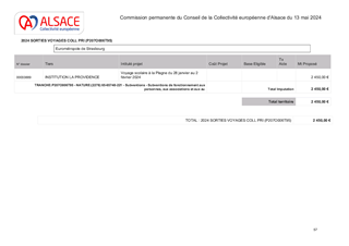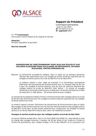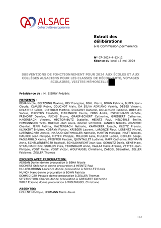 SUBVENTIONS DE FONCTIONNEMENT POUR 2024 AUX ÉCOLES ET AUX COLLÈGES ALSACIENS POUR LES CLASSES DE DÉCOUVERTE, VOYAGES SCOLAIRES, VISITES MÉMORIELLES