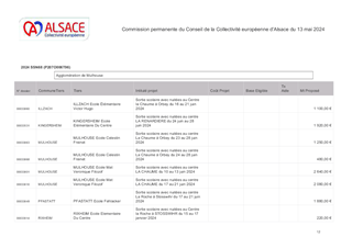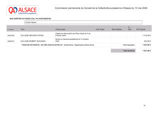 La Collectivité européenne d’Alsace, dans le cadre de sa politique éducative attribue des subventions pour les voyages et sorties scolaires organisés par les collèges et écoles publics et privés du Bas-Rhin et du Haut-Rhin. Le présent rapport a pour objet de proposer à la Commission permanente d’attribuer des subventions de fonctionnement pour un montant total de 50 114 € pour les voyages et sorties scolaires vers les lieux de mémoire alsaciens des collèges publics et privés du Bas-Rhin (841 élèves - 13 sorties et voyages scolaires) et les sorties scolaires avec nuitées pour les écoles publiques et privées du Haut-Rhin (1 046 élèves – 26 sorties scolaires avec nuitées).