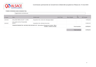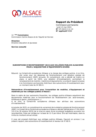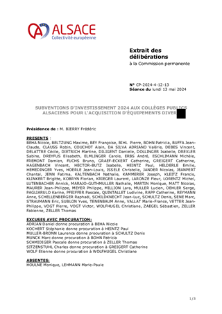 SUBVENTIONS D'INVESTISSEMENT 2024 AUX COLLÈGES PUBLICS ALSACIENS POUR L'ACQUISITION D'ÉQUIPEMENTS DIVERS