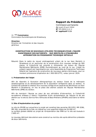 Dans le cadre du nouvel aménagement urbain de la rue Jean Mentelin à Strasbourg et en particulier de la construction d’un nouveau collège de 500 places, la Collectivité est amenée à réimplanter les locaux de l’Equipe Maintenance Bâtiments (EMB) Eurométropole au nord de la rue. L’objet du présent rapport est l’approbation par votre Assemblée du Programme Technique Détaillé de l’opération de construction de nouveaux ateliers techniques, pour un montant prévisionnel d’opération de 1 900 000 €TTC, valeur janvier 2024.